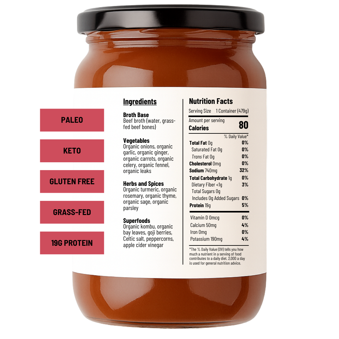 Beef broth (water, grass-fed beef bones) organic onions, organic garlic, organic ginger, organic carrots, organic celery, organic fennel, organic leaks, organic turmeric, organic rosemary, organic thyme, organic sage, organic parsley, organic kombu, organic bay leaves, goji berries, Celtic salt, peppercorns, apple cider vinegar.