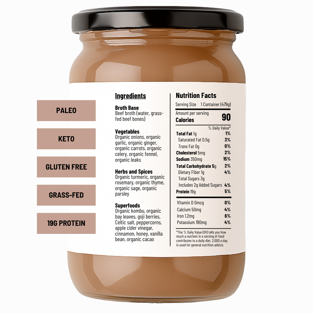 Chicken broth (water, organic chicken bones), organic onions, organic garlic, organic ginger, organic carrots, organic celery, organic fennel, organic leaks, organic turmeric, organic rosemary, organic thyme, organic sage, organic parsley, organic kombu, organic spices, organic basil, organic tomato puree, goji berries, Celtic salt, peppercorns, apple cider vinegar, cinnamon, raw honey, vanilla bean, organic cacao.