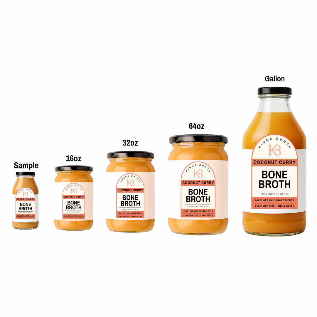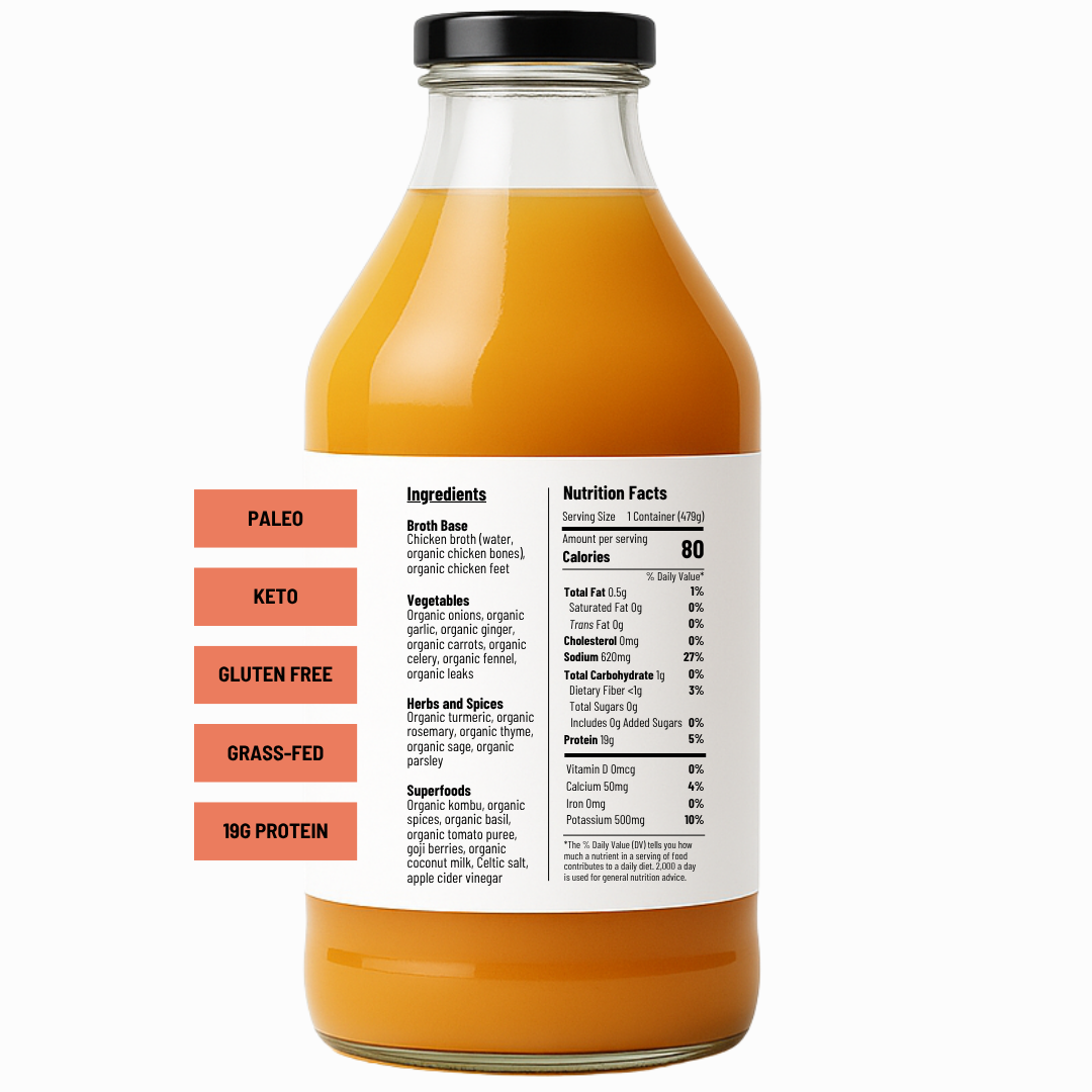 Chicken broth (water, organic chicken bones), organic chicken feet, organic onions, organic garlic, organic ginger, organic carrots, organic celery, organic fennel, organic leaks, organic turmeric, organic rosemary, organic thyme, organic sage, organic parsley, organic kombu, organic spices, organic basil, organic tomato puree, goji berries, organic coconut milk, Celtic salt, apple cider vinegar.